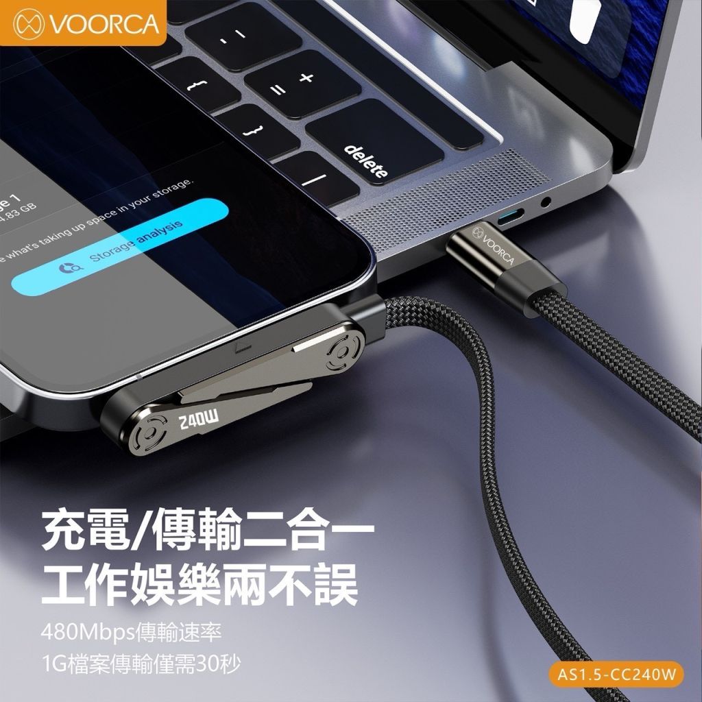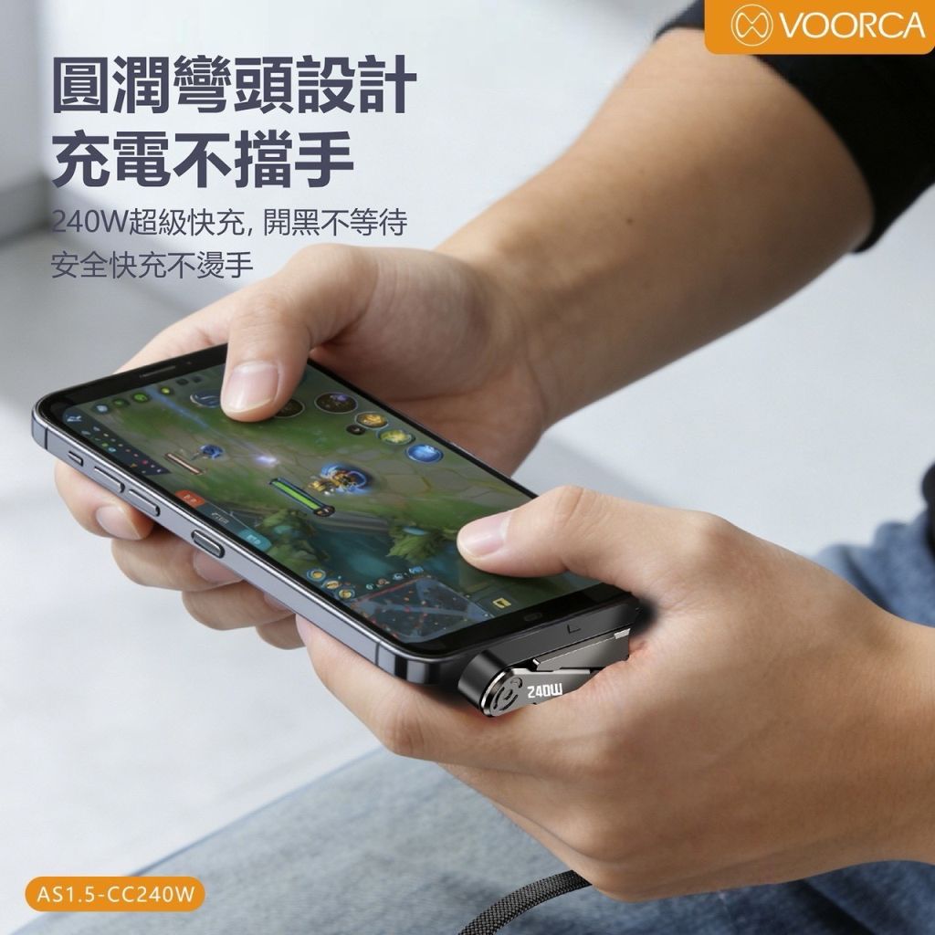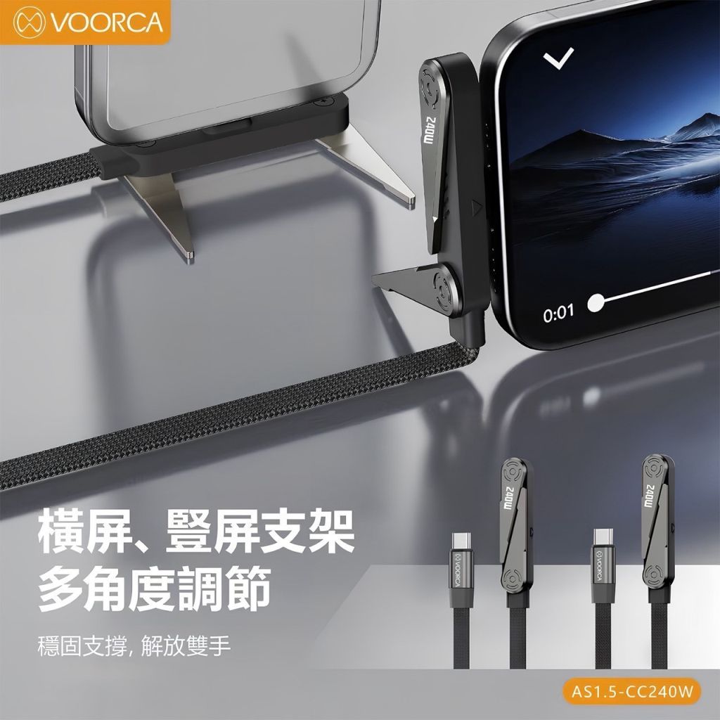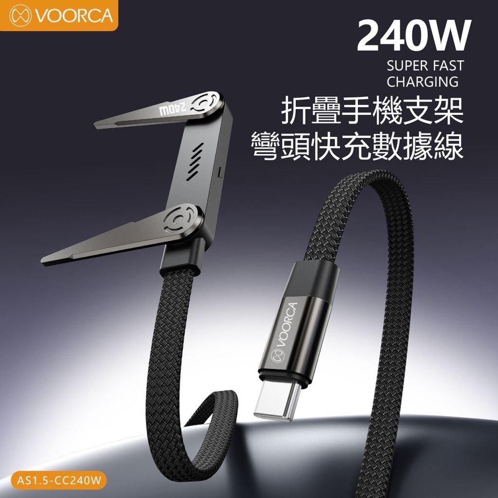 整合 240W超高功率快充+可旋轉支架+彎頭設計,讓充電、追劇、遊戲一次到位。